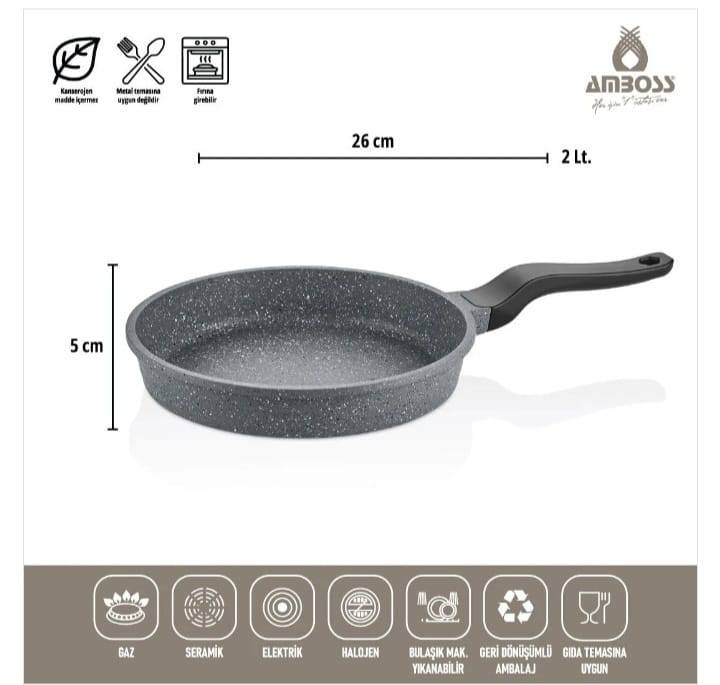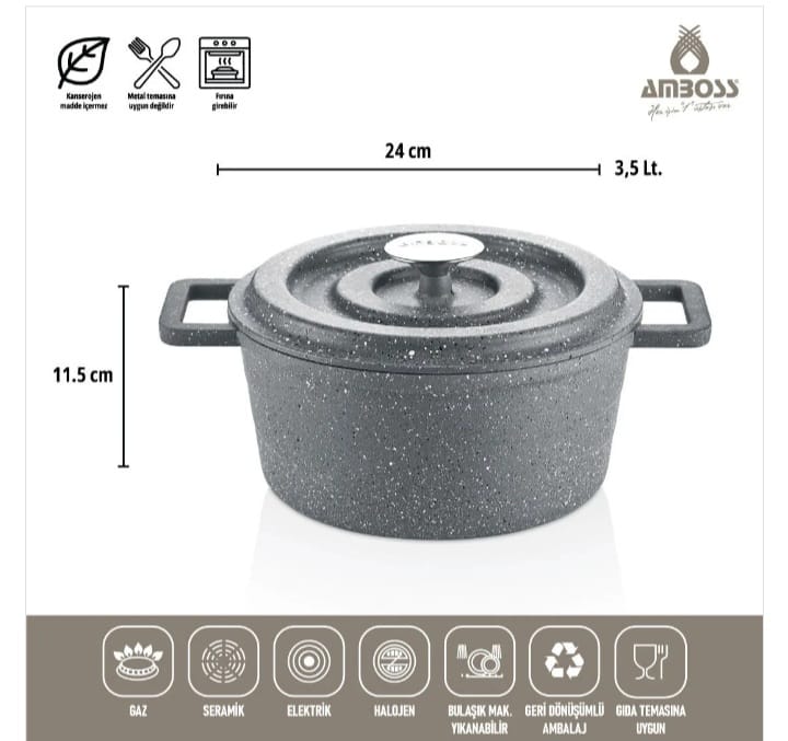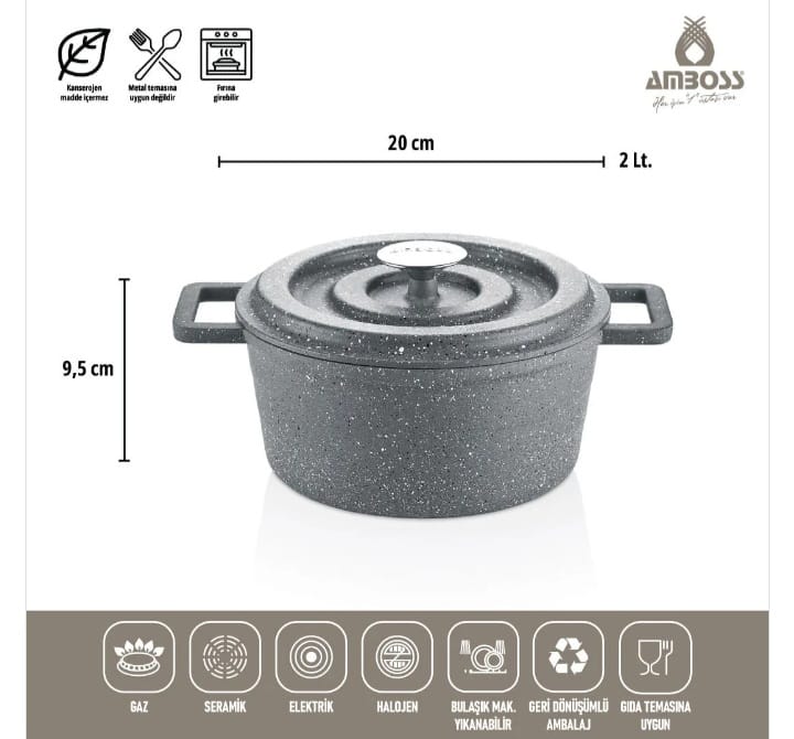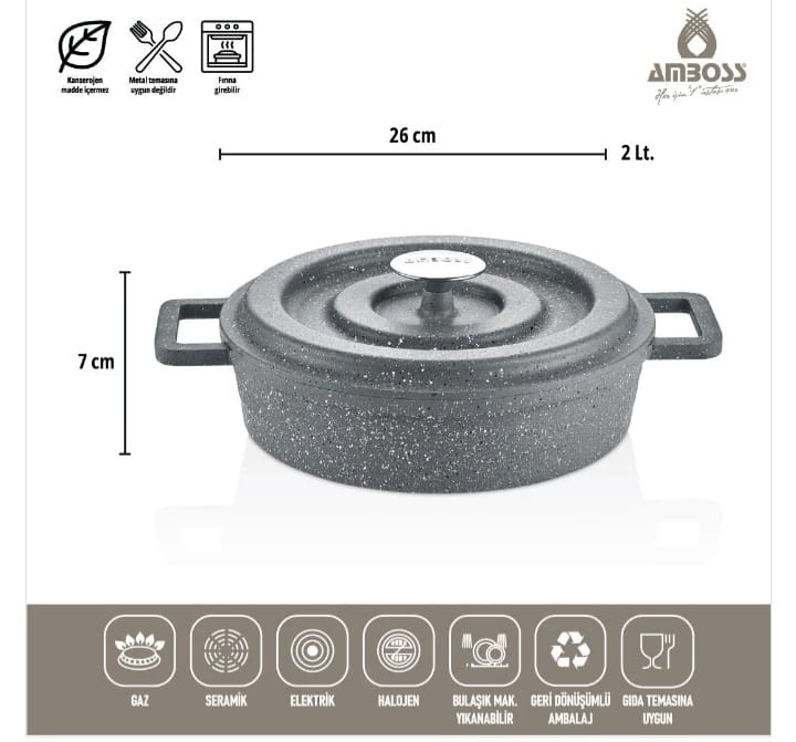 مميزات طقم أواني الطهي النحاسي Amboss الرمادي المصنوع من الحديد الزهر، والمكون من 7 قطع: طلاء التيتانيوم: بفضل طلاء التيتانيوم، تتميز الأواني بمقاومة فائقة للخدوش والاحتكاك. مقاومة للخدش: بفضل طلاء التيتانيوم، تتميز الأواني بمقاومة فائقة للخدوش والاحتكاك.