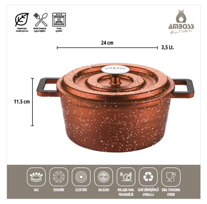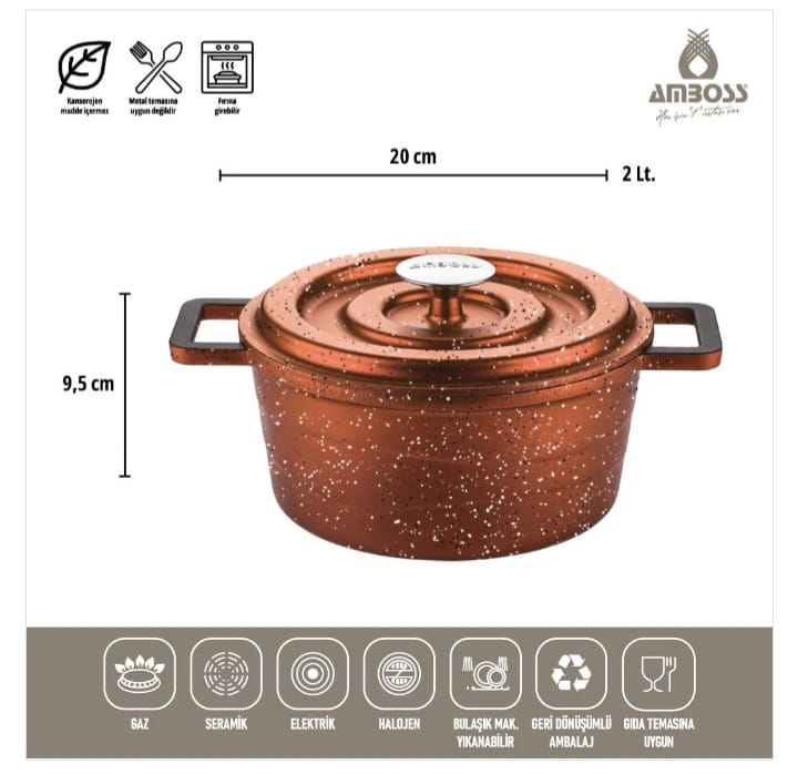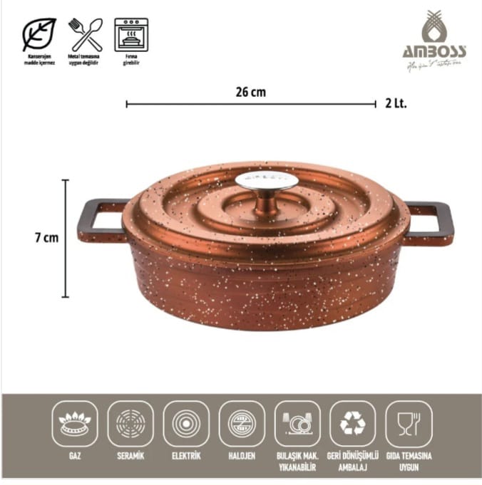 طقم أواني طهي أمبوس النحاسية، ٧ قطع: الطعم والمتانة تلتقيان في مطبخك! هل ترغب بتحضير وجبات شهية وصحية؟ طقم أواني طهي أمبوس كوارتز، 7 قطع، مصنوع من الحديد الزهر (نحاسي-رمادي) هو الخيار الأمثل لك! هذا الطقم المكون من 7 قطع يُمكّنك من طهي جميع أنواع الأطباق بسهولة وإتقان. مميزات طقم أواني طهي أمبوس النحاسية، 7 قطع - كيرشيلي: طلاء التيتانيوم: بفضل طلاء التيتانيوم، تتمتع الأواني بمقاومة فائقة للخدوش والاحتكاك. مقاومة للخدش: بفضل طلاء التيتانيوم، تتمتع الأواني بمقاومة فائقة للخدوش والاحتكاك. مناسب لجميع أنواع المواقد، باستثناء الحث الحراري: يمكن استخدام المجموعة على جميع أنواع المواقد، باستثناء الحث الحراري. آمنة للاستخدام في غسالة الأطباق: الأواني آمنة للاستخدام في غسالة الأطباق، مما يُسهّل غسلها. طقم أواني طهي أمبوس النحاسية المصبوبة - كيرشيلي، 7 قطع، المحتويات: قدر عميق 20 سم (3.35 لتر) قدر عميق 24 سم (6 لتر) قدر منخفض 26 سم (3.35 لتر) مقلاة 26 سم (3.5 لتر) ماذا يُمكنك استخدامه مع طقم أواني الطهي النحاسية أمبوس؟ يمكنكِ تحضير أطباق الخضار واليخنات. يمكنكِ طهي الشوربات والطواجن. يمكنكِ تحضير الأطباق الرئيسية كالأرز والمعكرونة. يمكنكِ طهي جميع أنواع الأطباق بسهولة في المطبخ. مزايا طقم أواني الطهي النحاسي أمبوس - كيرشيلي، المكون من 7 قطع: متين ومقاوم. يوفر خيارات طهي لذيذة وصحية. سهل التنظيف. يمكن استخدامه في أنواع مختلفة من المقالي. آمن للغسل في غسالة الأطباق. يُضفي لمسة جمالية على مطبخكِ بتصميمه الأنيق والعصري. طقم أواني الطهي النحاسي أمبوس - كيرشيلي، المكون من 7 قطع، اشترِ الآن وابدأي بتحضير أشهى الوجبات!