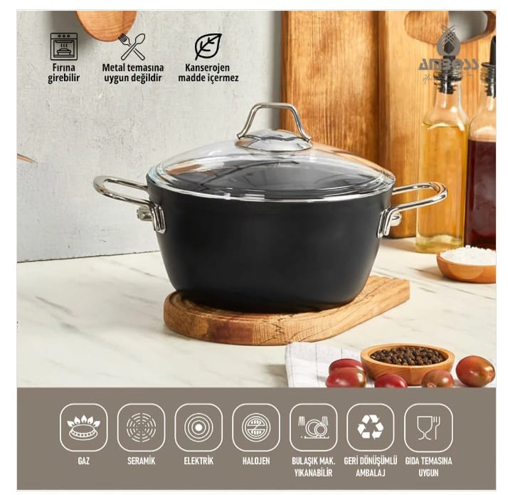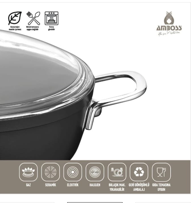 آمنة للاستخدام في غسالة الأطباق. حاصلة على شهادات عالمية، ولا تحتوي على أي مواد ضارة بصحة الإنسان (بكتيريا أو مسرطنة). يتميز بسطح غير لاصق مقاوم للهب. يوفر متانة فائقة. يمكن طهي البيض بدون زيت. يمكن طهي الخضراوات بدون زيت. بفضل طلاء التيتانيوم الخاص على منتجاتنا، لن تخدش أو تصدأ عند استخدامها بشكل صحيح. يسخن بسرعة ويوزع الحرارة بالتساوي، مما يسمح لك بالطهي دون فقدان النكهة. لإضافة لمسة من الأناقة إلى مطبخك ونكهة مميزة لأطباقك، فإن طاجن أمبوس الداكن العميق مصمم خصيصًا لك.