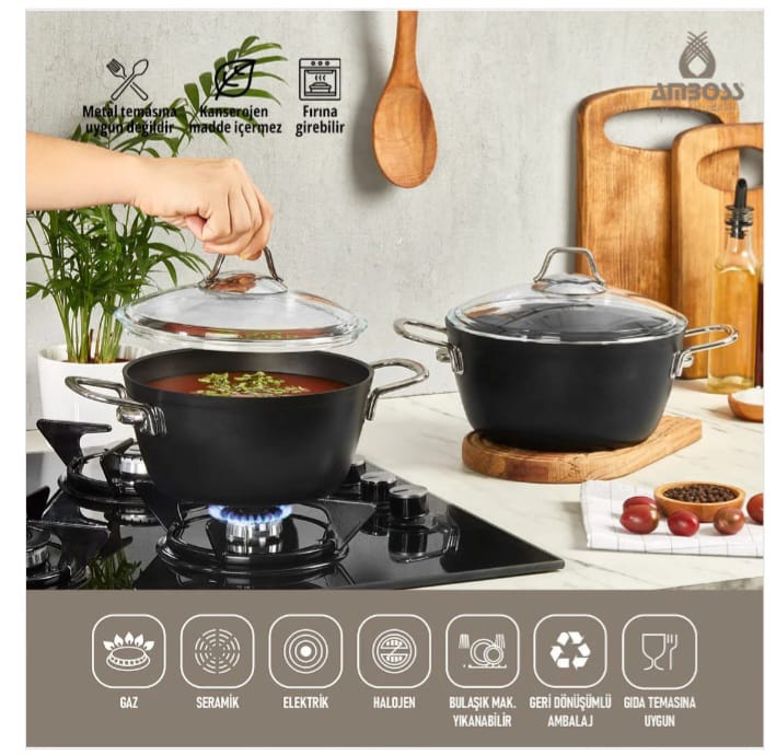 توفر قدور أمبوس الداكنة توزيعًا متوازنًا للحرارة في درجات الحرارة المنخفضة والعالية. بفضل التصنيع عالي التقنية في ورش أمبوس، تتميز بسهولة الاستخدام بفضل مقابضها المريحة والمقاومة للخدش والحرارة.