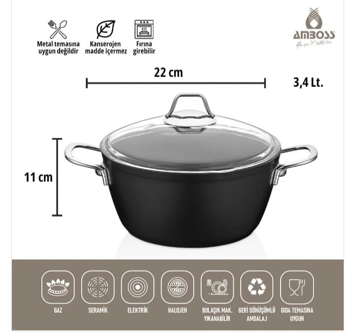 طلاء تيتانيوم ثلاثي الطبقات أسود 22 سم 3.4 لترآ من امبوس للاستخدام في الفرن مناسب لمواقد الحث. مقاوم للخدش مقاوم للصدمات لا يحترق أو يلتصق مقابض مريحة ومقاومة للحرارة وعاء عميق غطاء زجاجي