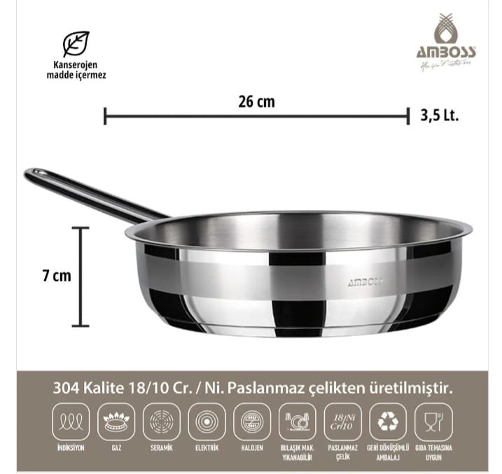 مقبض الفولاد المقاوم للصدا 26 × 7 سم / 3.5 لتر . الفولاد 18/10 مقاوم للصدأ. قاعدة كبسولة الالمنيوم18/10 مقاوم للتآكل والتشوه مناسب لجميع أنواع المواقد